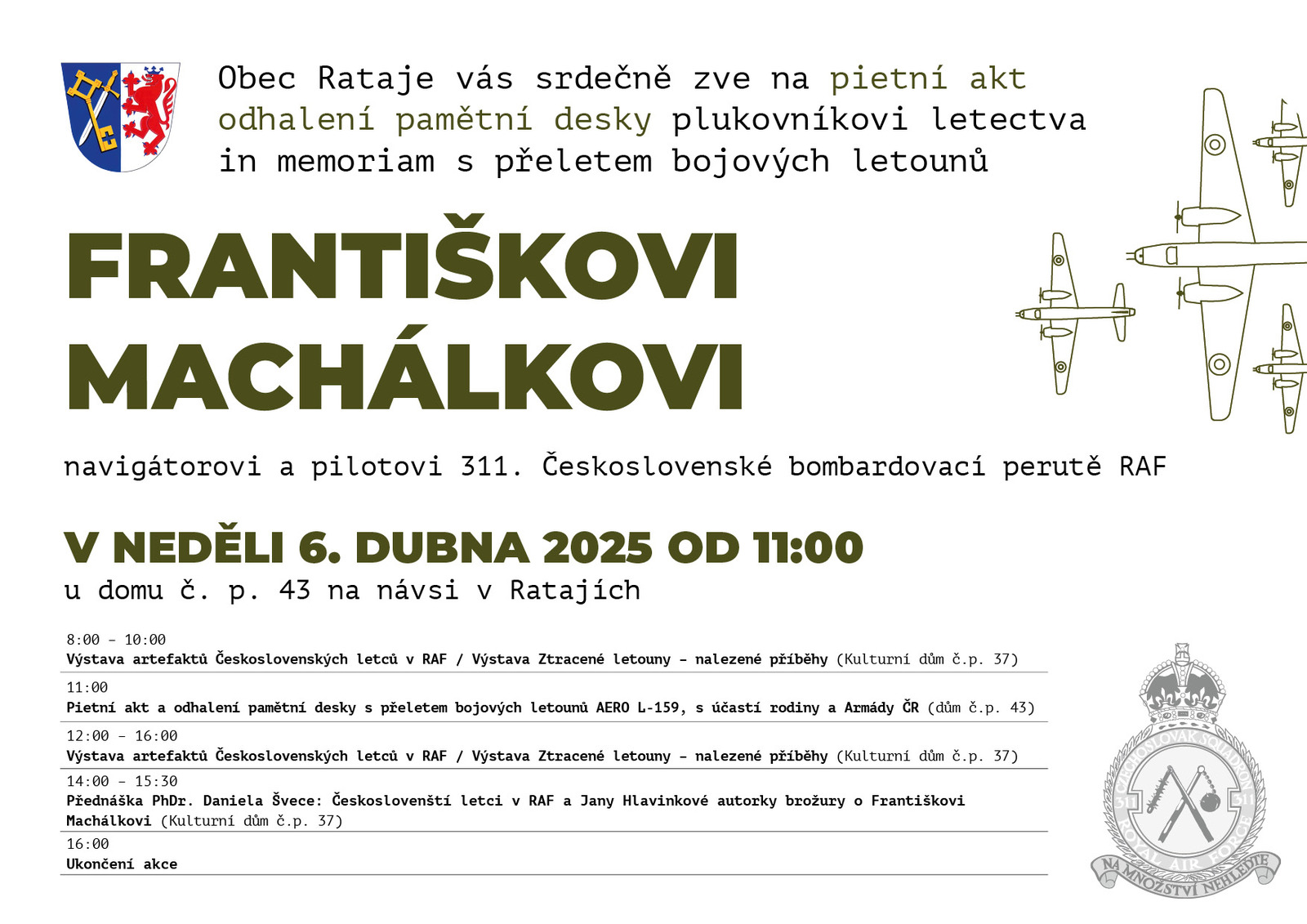 Úvod > Život v obci > Aktuality a hlášení > POZVÁNKA - Odhalení pamětní desky Františkovi Machálkovi, československému letci RAF