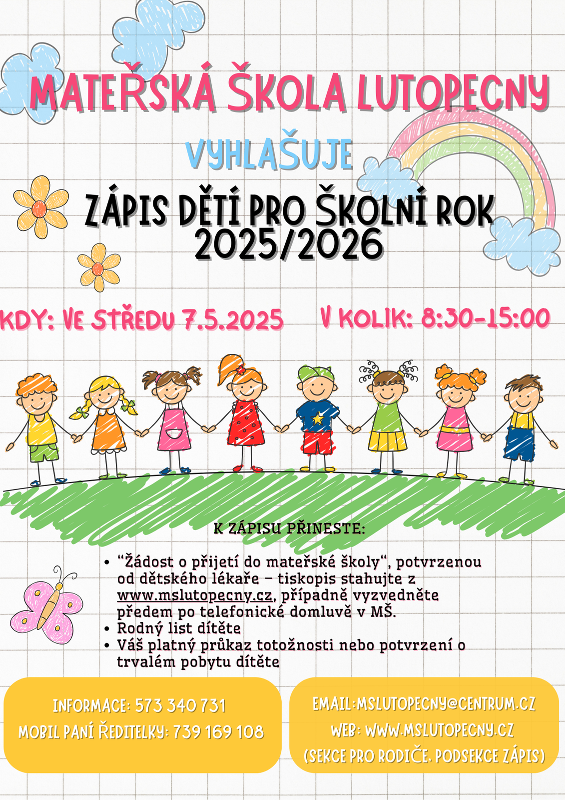 Dne 7. 5. 2025 v čase od 8:30 do 15:00 bude v naší mateřské škole probíhat zápis nových dětí pro školní rok 2025/2026.